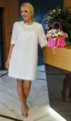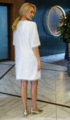 Платье А- образного силуэта, на подкладке. Перед с нагрудными выточками. Спинка со средним швом с разрезом и застёжкой на навесную петлю и пуговицу. Рукава втачные, одношовные, короткие.