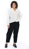 Брюки типа «банан», с притачным поясом по боковым на резнике, с застёжкой типа «гульфик» на молнию и по краю пояса на петлю, пуговицу. С конструктивной выточкой понизу передних и задних частей. Передние части с боковыми карманами, с мягкой застроченной складкой выходящей от входа кармана. Задние части с талевыми выточками и мягкой застроченной складкой от верха.